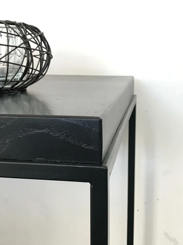 Deze stijlvolle bijzettafel is vervaardigd uit massieve eik met een zwart gebeitst eikenblad. Het blad heeft een bladdikte van 4 cm, wat zorgt voor een robuuste en moderne uitstraling.