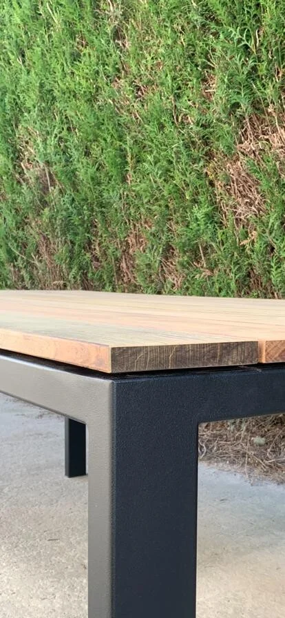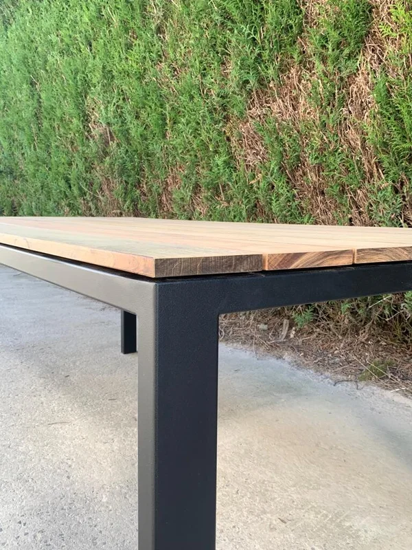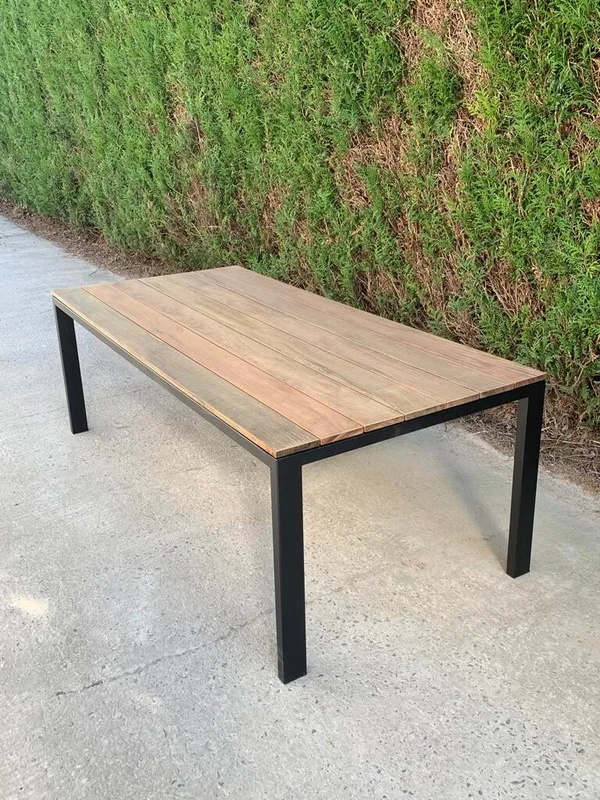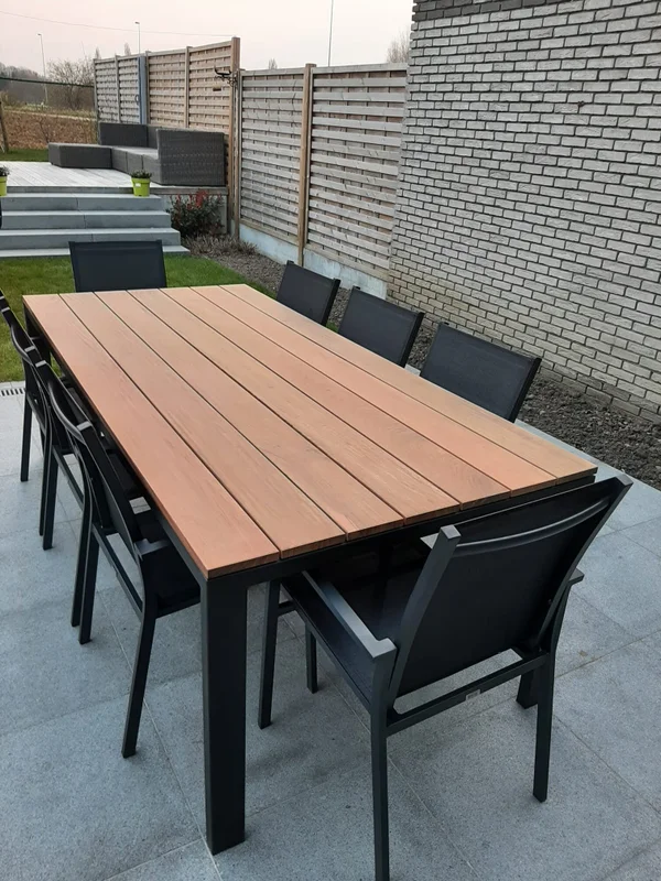 De buitentafel met een zwevend blad is gemaakt van duurzaam Ipé-hout, ideaal voor buitengebruik. Het onderstel bestaat uit stevige 80/40 mm buisprofielen, gemetaliseerd en gepoedercoat voor extra bescherming tegen weersinvloeden. Het blad heeft een dikte van 21 mm en de afmetingen op de foto zijn 220×100 cm, met een hoogte van 76 cm. Deze tafel is perfect voor elke tuin of terras. Maatwerk is mogelijk om de tafel volledig aan jouw wensen aan te passen.