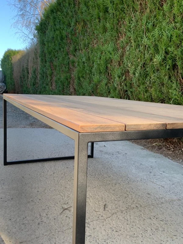 De buitentafel met U-onderstel is gemaakt van hoogwaardig Ipé-hout, wat het een robuuste en duurzame keuze maakt voor buitengebruik. Het onderstel bestaat uit 30×30 mm buisprofielen, gemetaliseerd en gepoedercoat voor extra bescherming tegen de elementen. Het blad heeft een dikte van 21 mm, en de afmetingen op de foto zijn 220×100 cm, met een hoogte van 76 cm. Deze tafel is een uitstekende keuze voor een stijlvolle en functionele tuin- of terrasinrichting. Maatwerk is mogelijk om de tafel aan jouw specifieke wensen aan te passen.