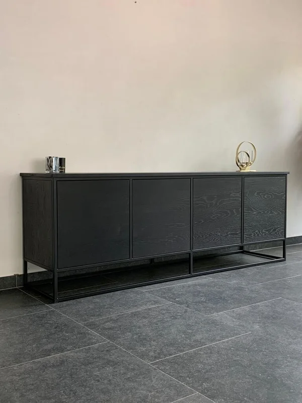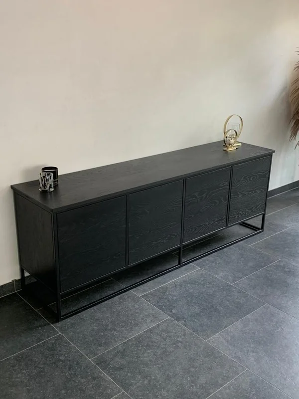 Dressoir Alba in massieve eik, behandeld met 2C Monocoat Black voor een vet- en waterafstotende afwerking. Hoogte 75 cm, volledig op maat samengesteld naar uw wensen. Afmetingen op foto: L 210 cm x Br 50 cm x H 75 cm. Maatwerk mogelijk voor een perfect passend meubel in uw interieur.
