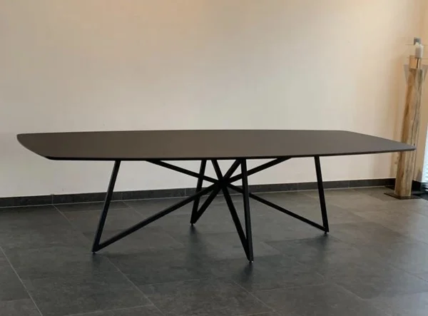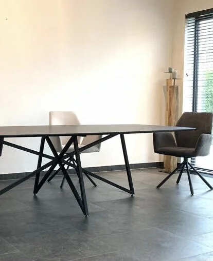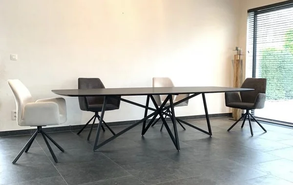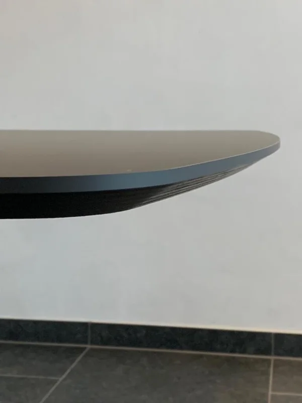 De eettafel Fly Deens Ovaal Fenix heeft een blad van Fenix FNX/MTX, opgedikt met Finse berk en afgewerkt met een toplaag in Fenix HPL NERO INGO (zwart). Het blad is 23 mm dik en heeft een verjongde rand, waardoor het een elegante en moderne uitstraling krijgt. Je kunt kiezen uit meer dan 100 kleuren voor de afwerking, en maatwerk is mogelijk om de tafel aan jouw specifieke wensen aan te passen. De afmetingen op de foto zijn 280×120 cm.