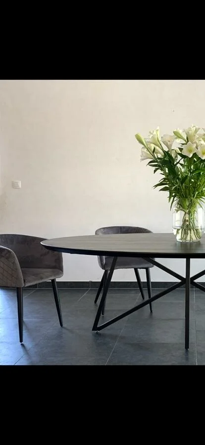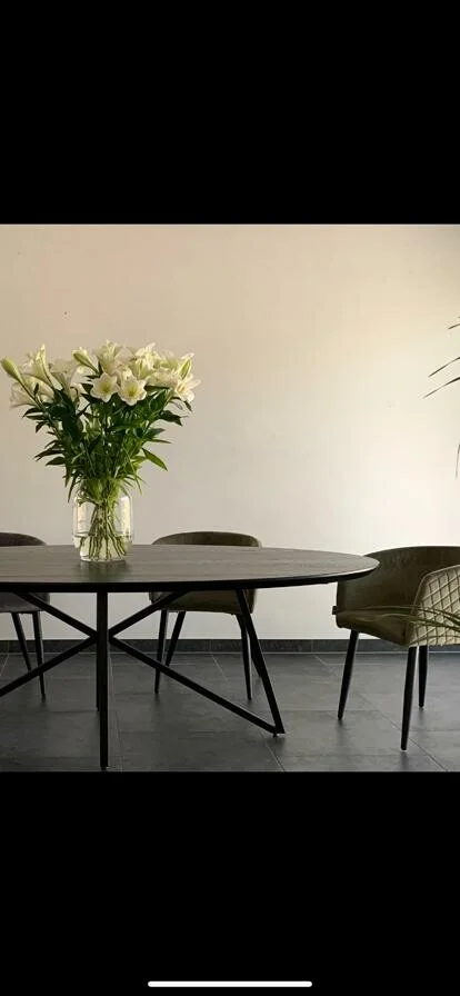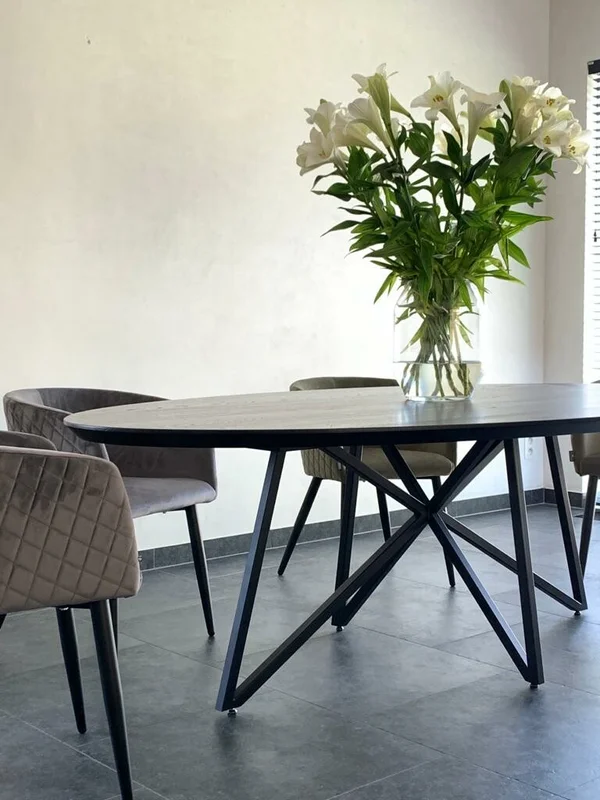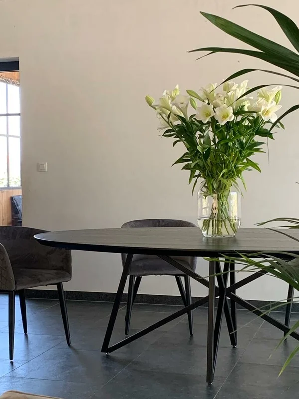 Eettafel Fly Elips Black in massieve eik. Bladdikte 4 cm met verjongde rand. Blad gelakt in RAL 9005. Onderstel Fly 30/30 mm. Afmetingen op foto: 220×120 cm. Hoogte 76 cm. Maatwerk mogelijk.
