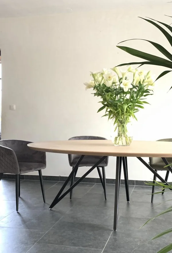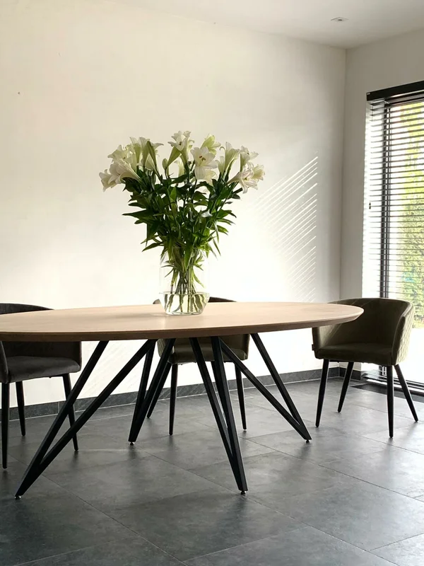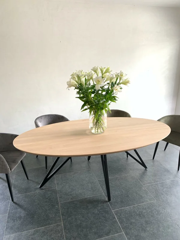 Eettafel Harper Elips in massieve eik. Bladdikte 4 cm met verjongde rand. Blad behandeld met een matte invisible coating. Afmetingen op foto: 240×120 cm. Hoogte 76 cm. Maatwerk mogelijk.