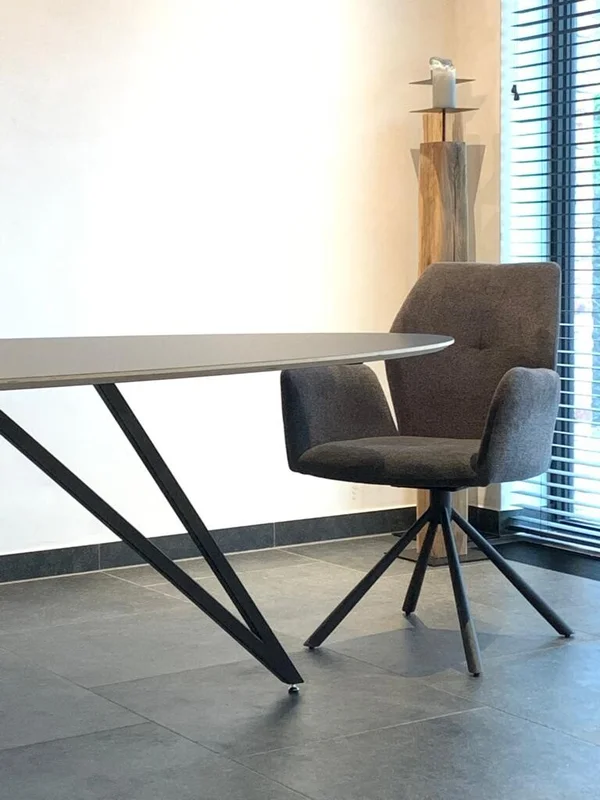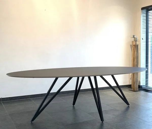 De eettafel Harper ovaal Fenix heeft een blad van Fenix FNX/MTX, opgedikt met Finse berk en afgewerkt met een toplaag in Fenix HPL NERO INGO (zwart). Het blad is 18 mm dik en heeft een verjongde rand voor een strakke, moderne uitstraling. Er is keuze uit meer dan 100 kleuren voor de afwerking, en maatwerk is mogelijk om de tafel perfect te maken voor jouw interieur. De afmetingen op de foto zijn 260×120 cm.