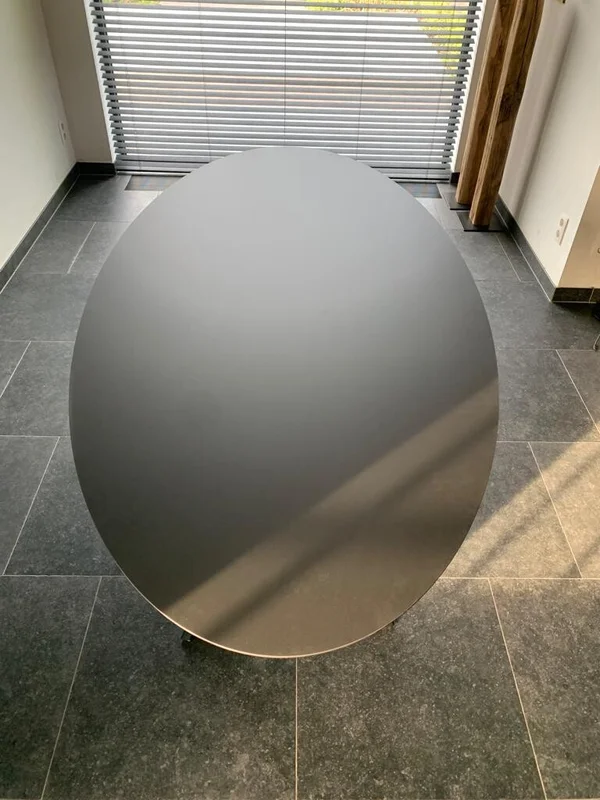 Eettafel Mikado Fenix ovaal, gemaakt van Fenix HPL volkern, met een bladdikte van 12mm en verjongde rand (randafwerking naar keuze). Het blad is zwart (Nero Ingo), krasbestendig en matte afwerking. Maatwerk mogelijk om het perfect aan jouw interieur aan te passen.