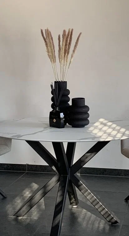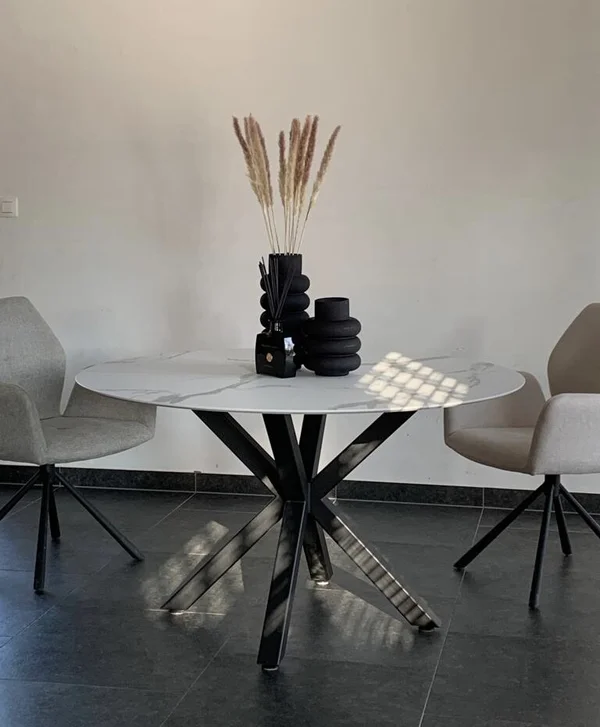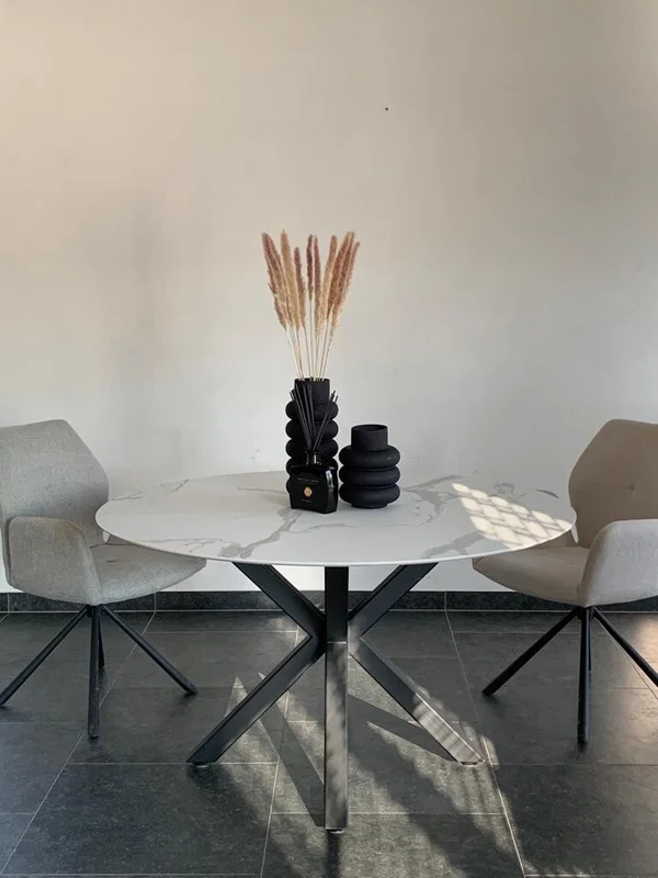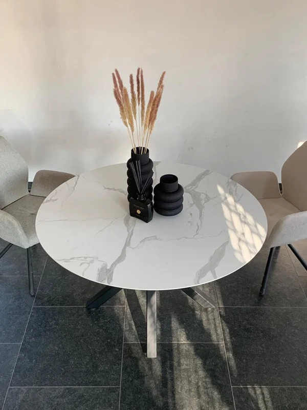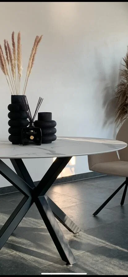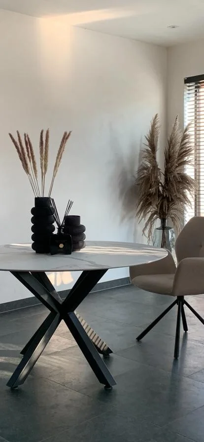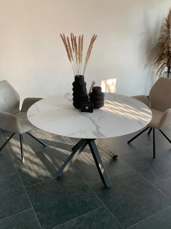 De eettafel rond Fenix 3D heeft een Fenix HPL volkern blad van 12 mm dik, afgewerkt met een verjongde rand. De randafwerking is naar keuze. Het blad heeft een marmerlook in de kleur 3493 KER. Maatwerk is mogelijk om de tafel naar wens aan te passen.