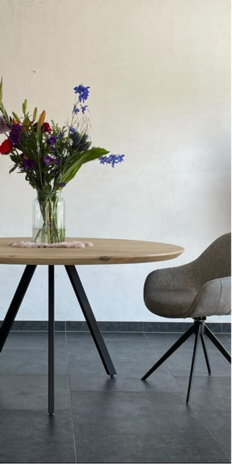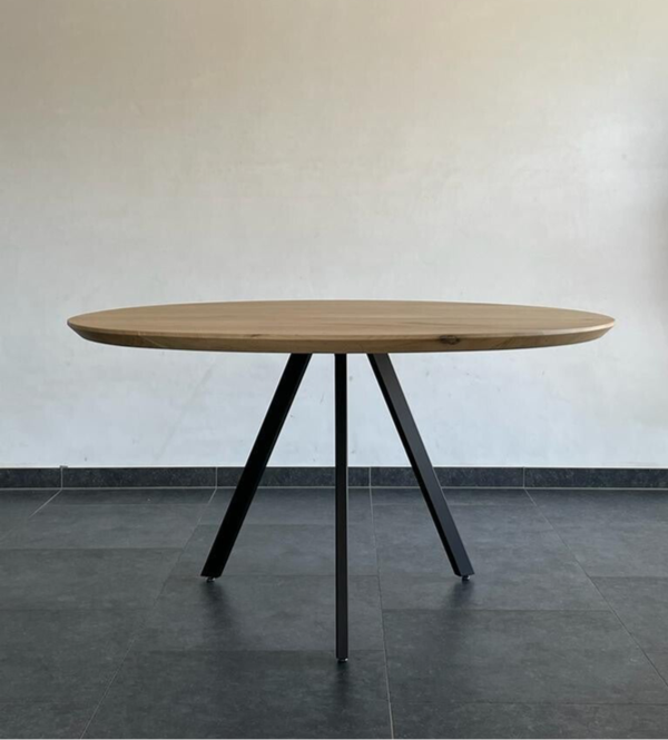 Ronde eettafel Odile met 3 poten in massieve eik. Bladdikte 4 cm met verjongde rand. Onderstel gepoederlakt in een fijne dia-structuur. Blad behandeld met een 2-componenten coating. Maatwerk mogelijk.