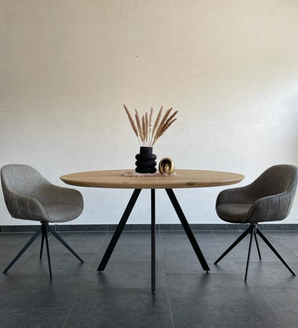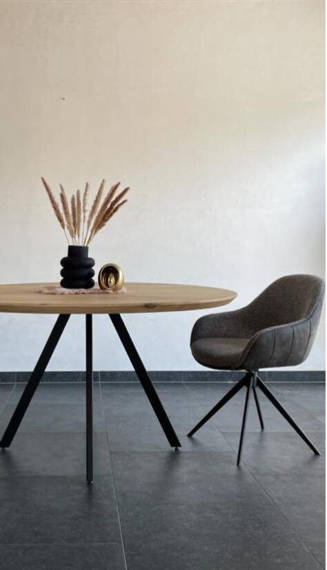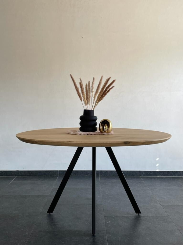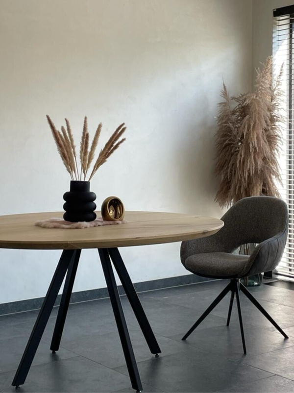 Ronde eettafel Odile met 4 poten in massieve eik. Bladdikte 4 cm met verjongde rand. Onderstel gepoederlakt in een fijne dia-structuur. Blad behandeld met een 2-componenten coating. Maatwerk mogelijk.