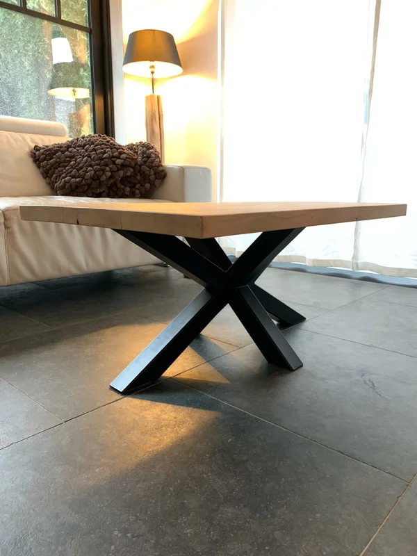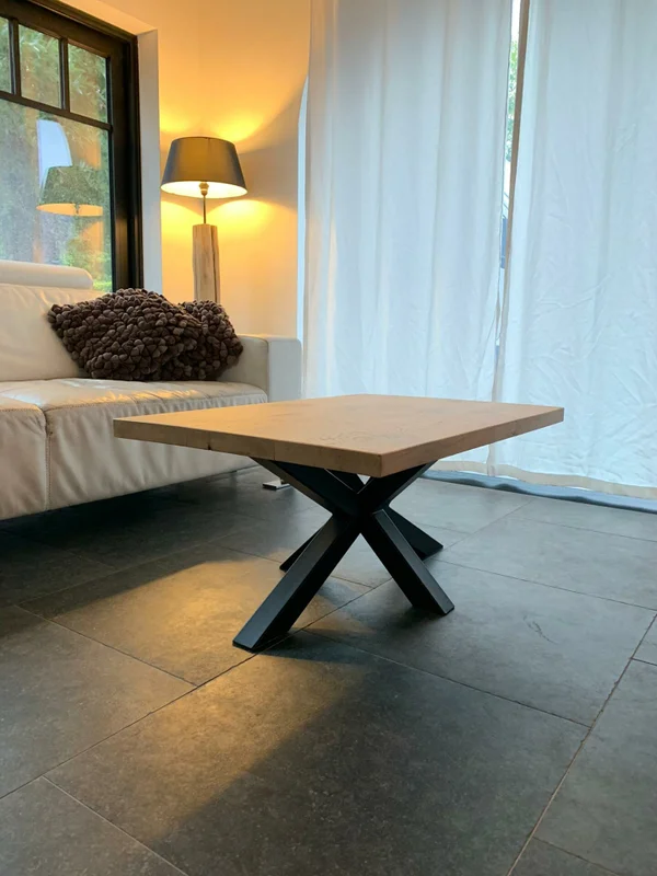 Salontafel in massieve eik met een 3D-onderstel van buisprofielen 60/60mm. Bladdikte 4 cm. Behandeld met een 2-componenten coating ter bescherming tegen vocht- en vetvlekken. Wachttijd: 3 tot 4 weken. Maatwerk mogelijk!