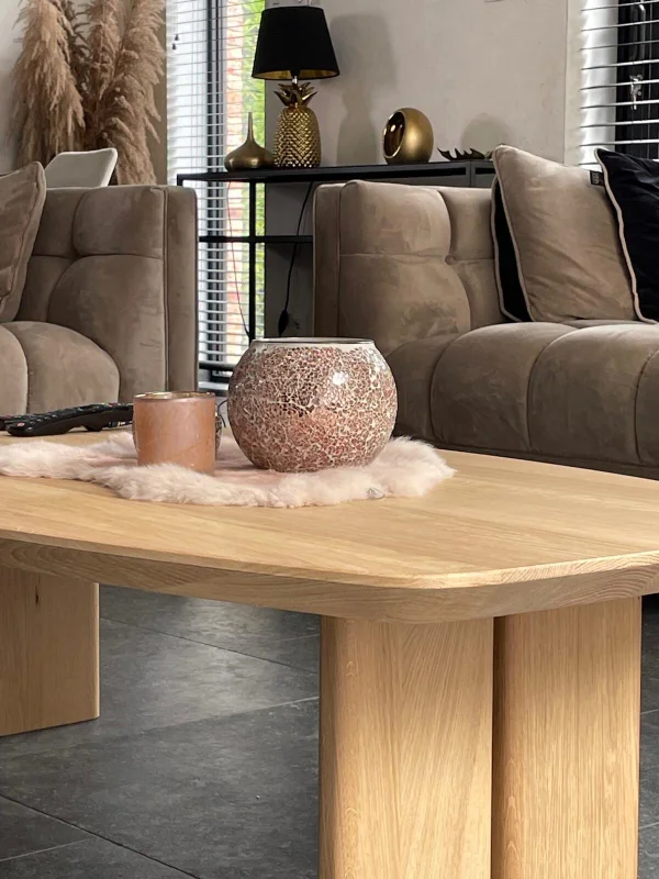 Salontafel Claire in Deens ovaal design, volledig vervaardigd uit massieve eiken. Behandeld met een matte parketvernis voor een natuurlijke, vet- en waterafstotende afwerking. Maatwerk mogelijk voor een elegant en tijdloos interieur.