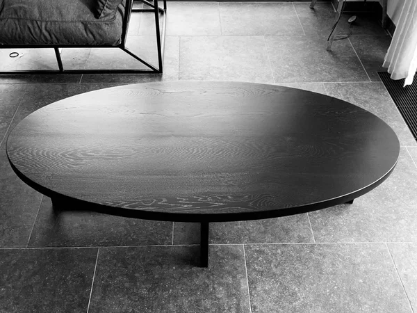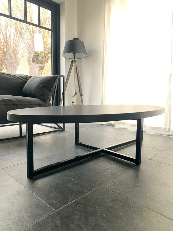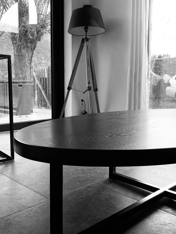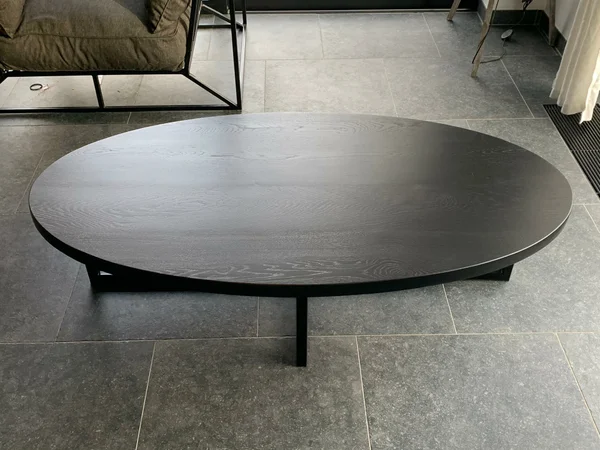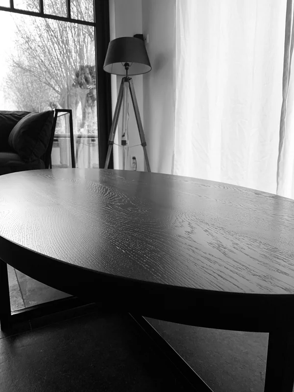 Salontafel Eclips in zwart gebeitst eiken, behandeld met krasvaste vernis voor een lange levensduur. De bladdikte is 4 cm, met stevige buisprofielen van 30/30 mm. Afmetingen op foto: 160×80 cm. Maatwerk mogelijk.
