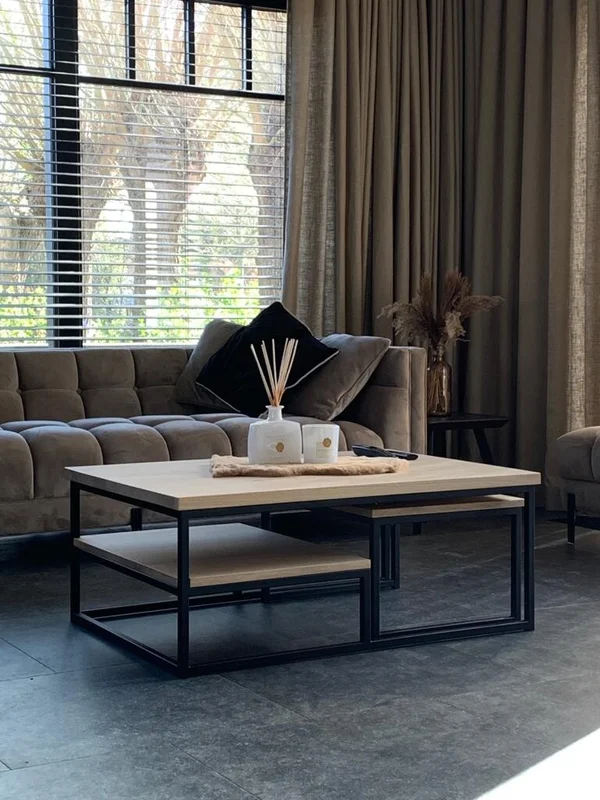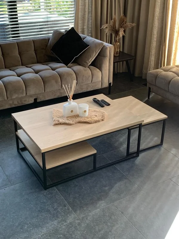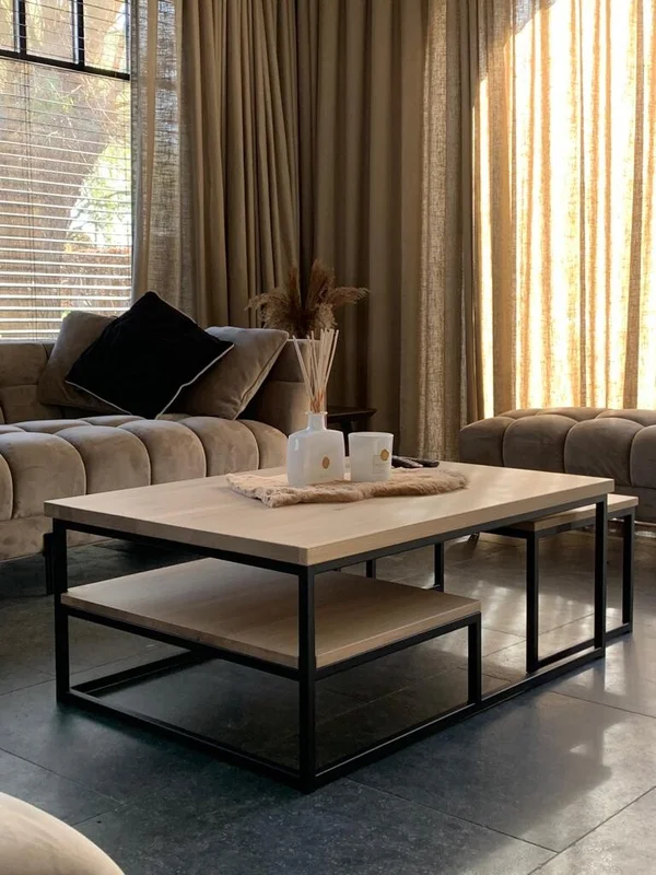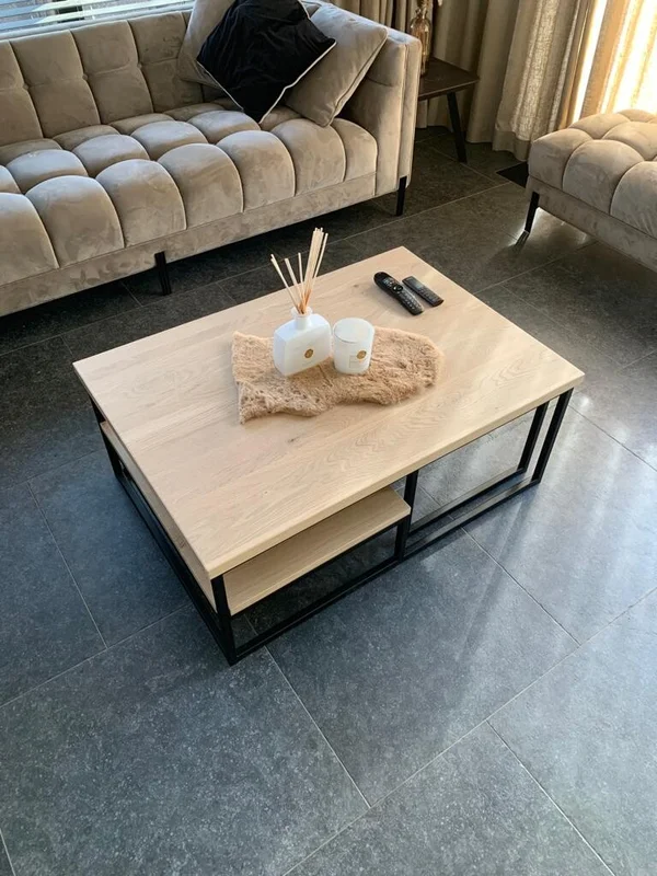 Salontafel met half dubbel verdiep Deluxe, vervaardigd uit massieve eik met een robuuste bladdikte van 3 cm. Het blad is behandeld met een 2-componenten coating voor een duurzame, vet- en waterafstotende afwerking. Stevig onderstel met buisprofielen van 20/20 mm in RAL 9005. Maatwerk mogelijk voor een perfect passend design.