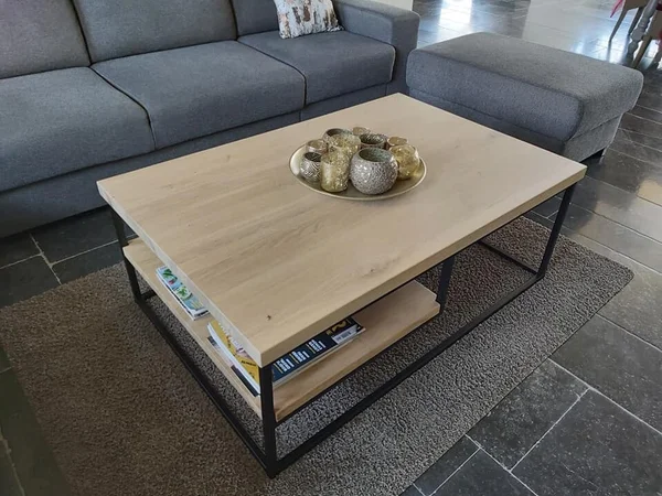 Salontafel in massieve eik met een half dubbel verdiep. Bladdikte bovenaan 4 cm, verdiep 3 cm dik. Buisprofielen 20/20mm. Behandeld met een 2-componenten matte coating, volledig waterafstotend. Maatwerk mogelijk!