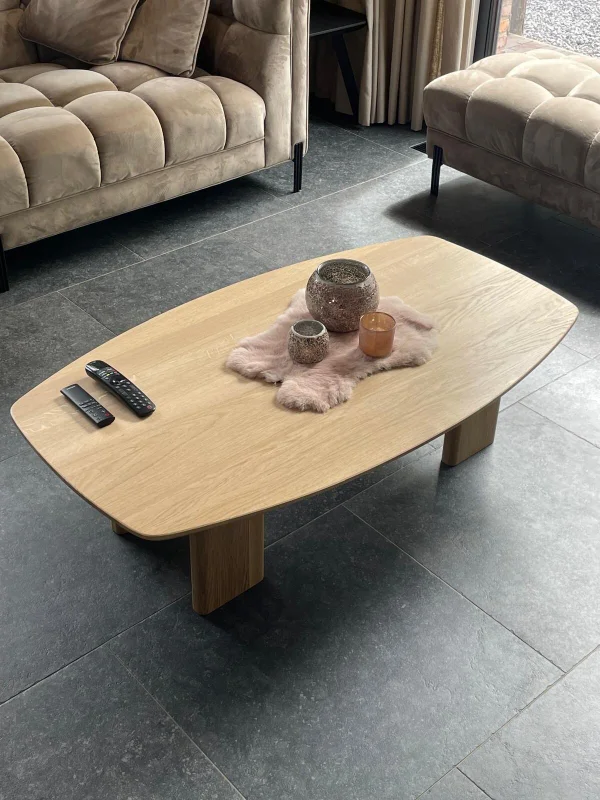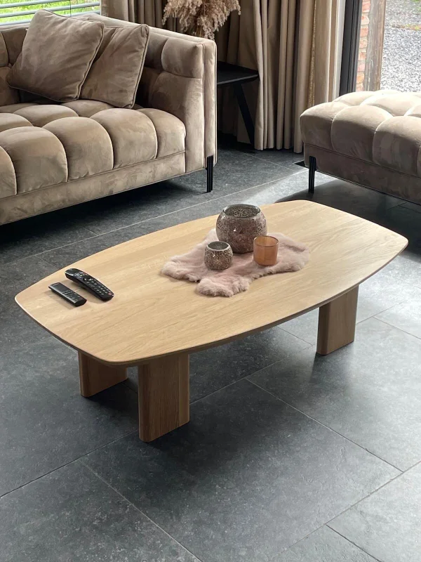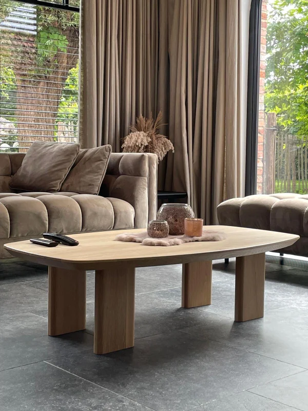 Salontafel Puur in Deens ovaal design, volledig vervaardigd uit massieve eiken. Behandeld met een matte parketvernis voor een natuurlijke, vet- en waterafstotende afwerking. Maatwerk mogelijk voor een tijdloos en elegant interieur.
