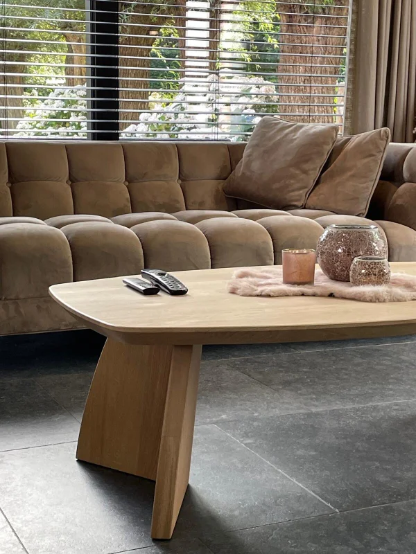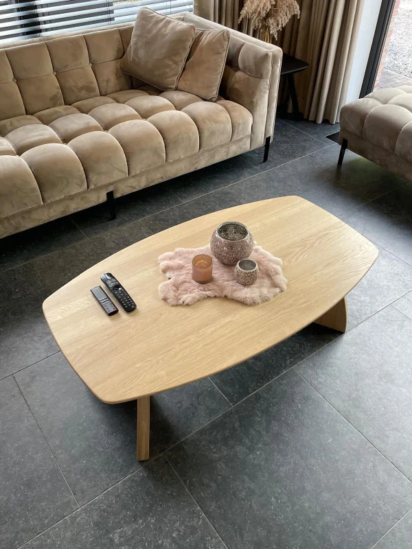Salontafel Roma in Deens ovaal design, volledig vervaardigd uit massieve eiken. Het blad is behandeld met een matte parketvernis voor een natuurlijke, vet- en waterafstotende afwerking. Maatwerk mogelijk voor een perfecte harmonie in uw interieur.