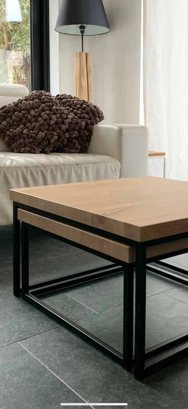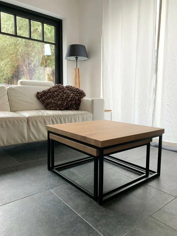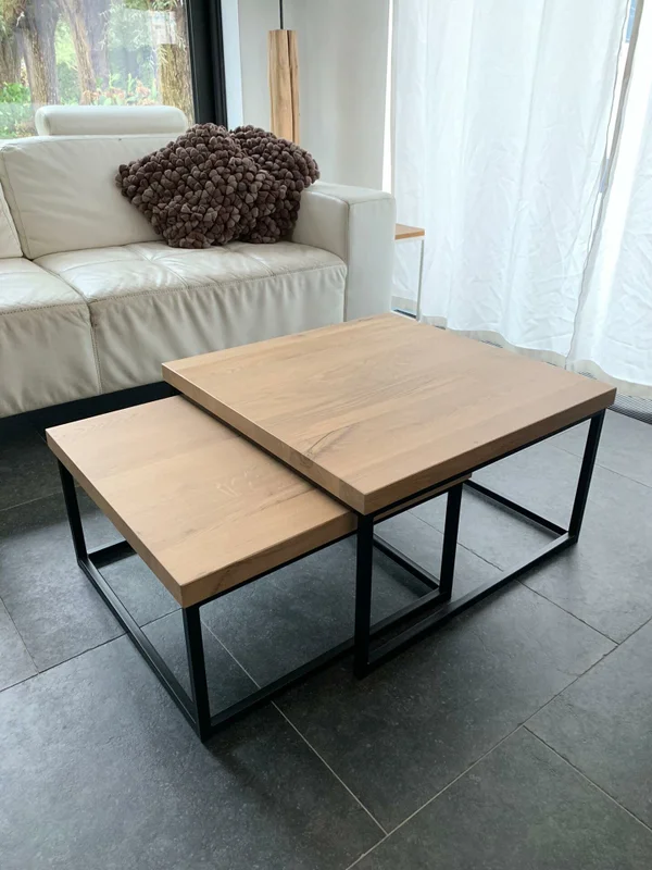 Salontafel set van 2 stuks in massieve eik, met bladdikte van 40 mm. Behandeld met een 2-componenten coating voor bescherming tegen vocht- en vetvlekken. Maatwerk mogelijk! Wachttijd: 3 tot 4 weken.