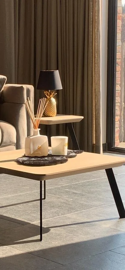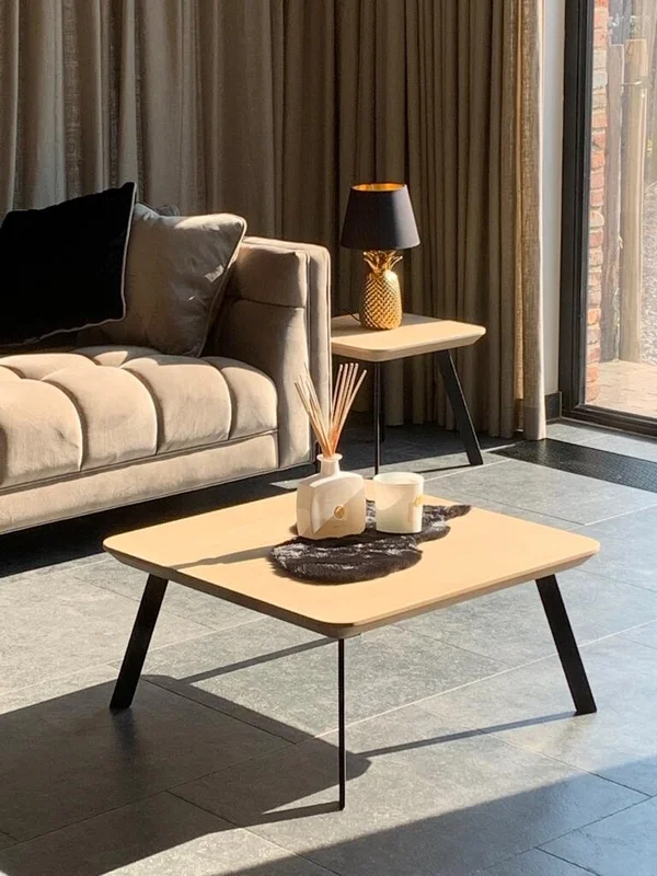 Salontafel set Globo Vierkant, vervaardigd uit massieve eik met een stevige bladdikte van 4 cm. Voorzien van afgeronde hoeken en een verjongde rand voor een verfijnde uitstraling. Het onderstel bestaat uit buisprofielen van 40/10 mm in vol staal. Het blad is behandeld met een 2-componenten coating voor een duurzame, vet- en waterafstotende afwerking. Afmetingen op foto: 50×50 cm (H 40 cm) + 70×70 cm (H 33 cm). Maatwerk mogelijk.