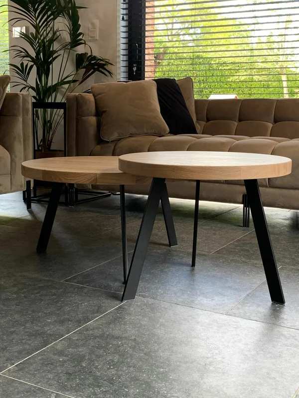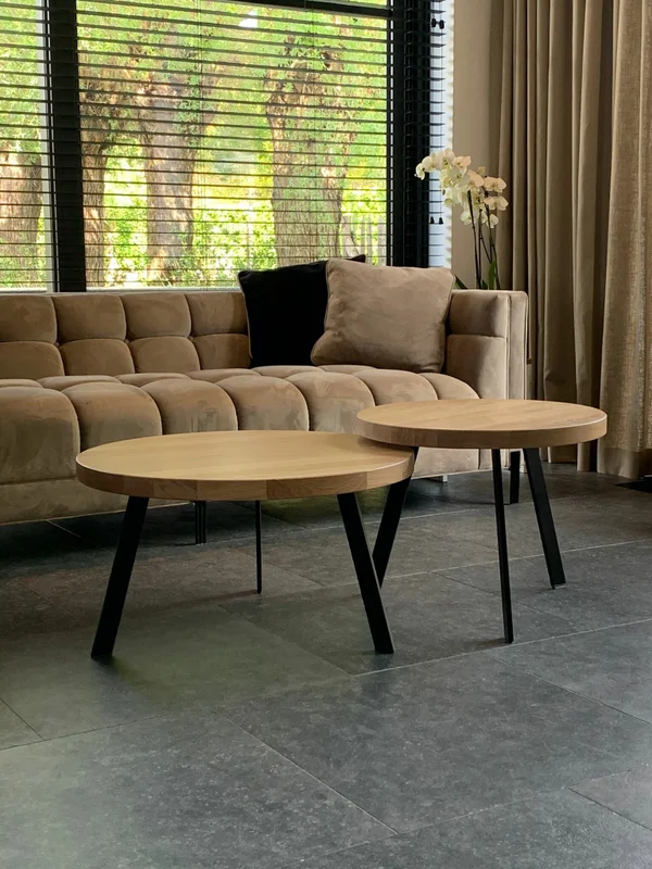 Salontafel set Globo, vervaardigd uit massieve eik met een bladdikte van 4 cm. Het onderstel is gepoederlakt voor een strakke uitstraling. De kleinste model heeft een hoogte van 41 cm, het grootste model 35 cm. Blad behandeld met een 2-componenten coating (vet- en waterafstotend). Maatwerk mogelijk.