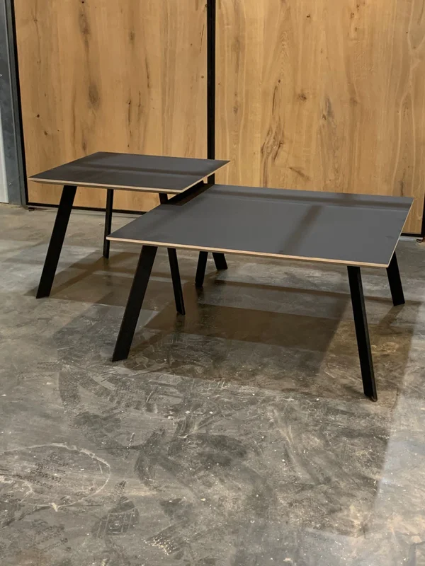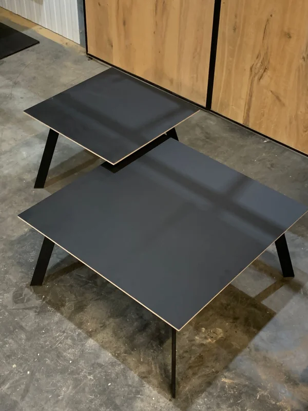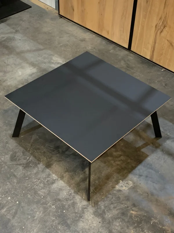 Salontafels Fenix Avalon vierkant, met een blad van Fenix FNX/MTX opgedikt met Finse berk. De toplaag is in Fenix HPL Nero Ingo (zwart), met een dikte van 18mm en een verjongde rand. Keuze uit meer dan 100 kleuren. Maatwerk mogelijk. De afmetingen op de foto zijn: 70x70cm (H 35cm) en 50x50cm (H 40cm).