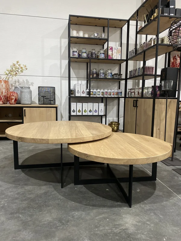 Salontafels M Poot 40/10mm, gemaakt van massieve eik met een bladdikte van 4 cm. De M-poten van 40/10 mm vol staal zorgen voor een krachtige en eigentijdse look. Maatwerk mogelijk. Afmetingen op foto: D 100 cm (H 40 cm) + D 80 cm (H 34 cm).