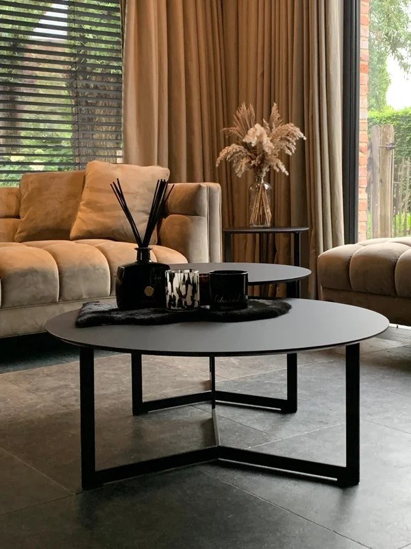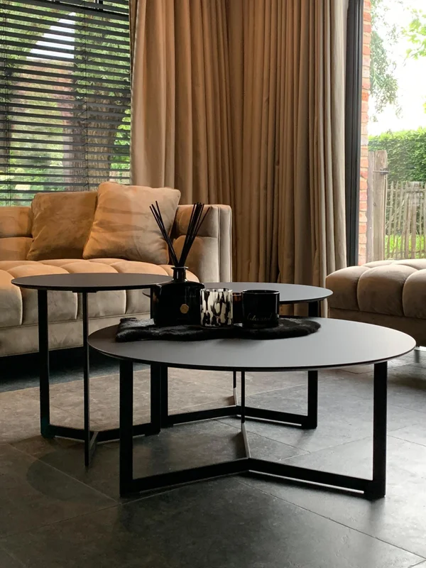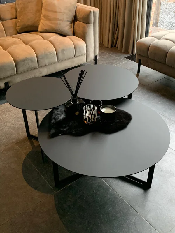 Salontafels set van 3 stuks, gemaakt van Fenix HPL met een bladdikte van 12mm. De kleur is Nero Ingo. Het onderstel heeft Y-poten van 30/10mm vol staal, gepoedercoat in RAL 9005. De afmetingen van de tafels op de foto zijn: D 80cm, D 60cm, en D 45cm. De hoogte van het model is 45cm. Maatwerk mogelijk.