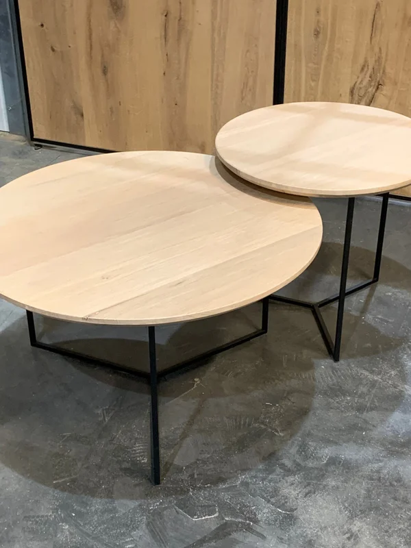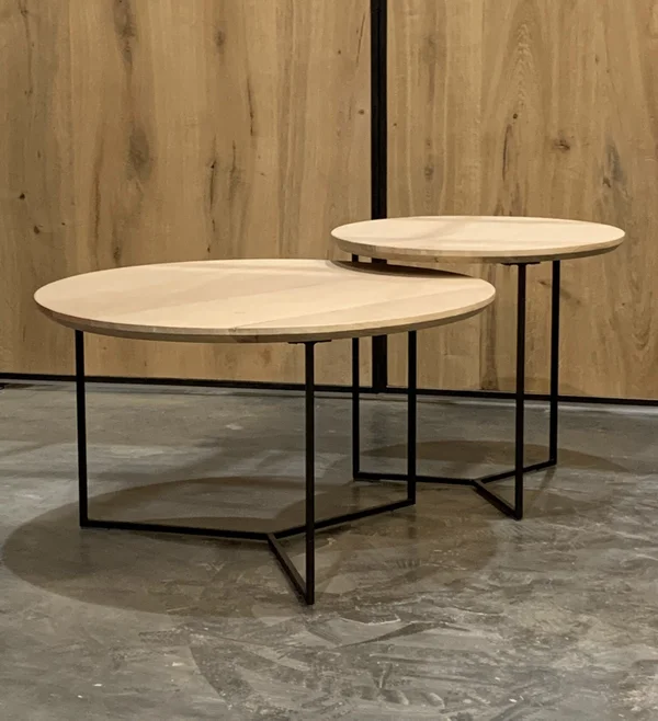 Salontafels (set) Y Poot 10/10mm, vervaardigd uit massieve eik met een bladdikte van 2 cm en een verjongde rand. De Y-poten van 10/10 mm vol staal geven de tafels een moderne en stevige uitstraling. Maatwerk mogelijk. Afmetingen op foto: D 70 cm (H 40 cm) + D 50 cm (H 45 cm).
