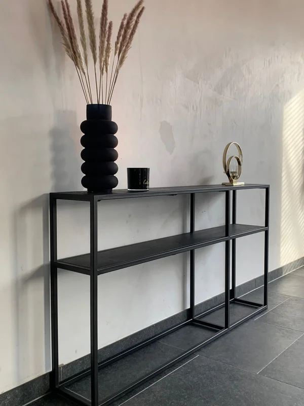 Sidetable Dubbel Verdiep Marly. Sidetable in massieve eik. Bladdikte 2cm. Buisprofielen 20/20mm RAL 9005. Blad is behandeld met 2C Monocoat Black. Maatwerk mogelijk.