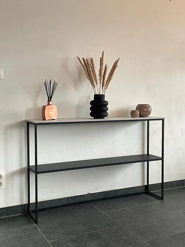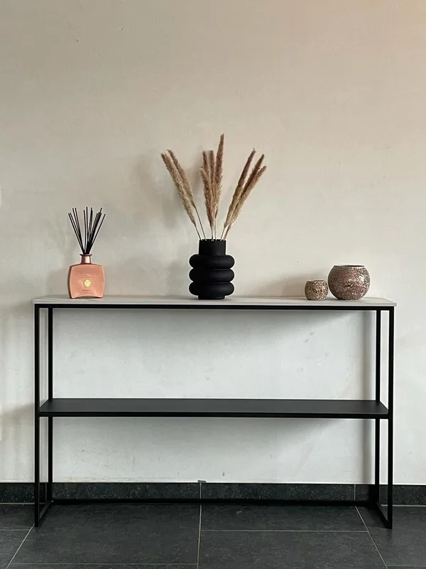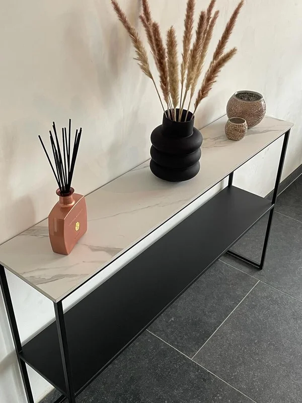 Sidetable Viktor. Bovenblad in Fenix marmer look. Onderste blad volledig in staal. Buisprofielen: 20/20mm, RAL 9005. Maatwerk mogelijk.