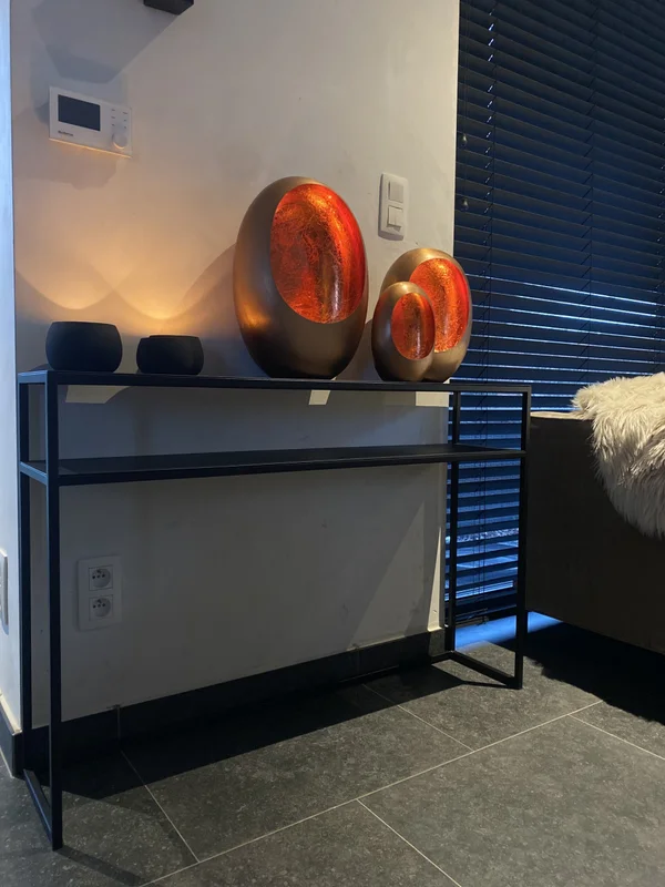 Sidetable volledig in staal. Gepoederlakt in RAL 9005 fijne dia structuur. Afmetingen op foto: L 100cm x Br 25cm x H 80cm. Maatwerk mogelijk.