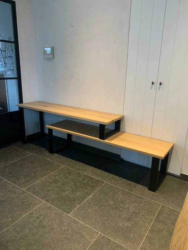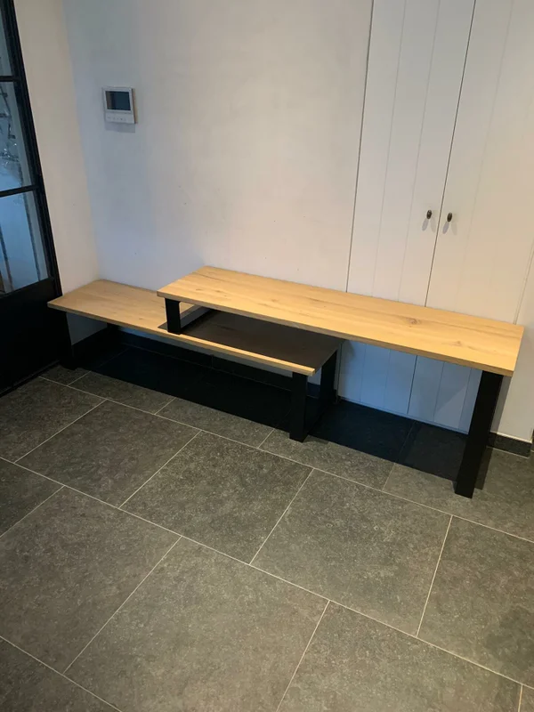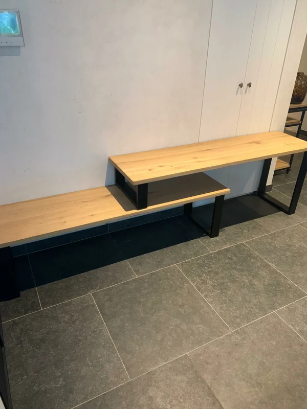 Tv-meubel inschuifbaar in massieve eik met inschuifbare delen, bladdikte van 2,3 cm en behandeld met een 2-componenten coating voor volledige waterafstotendheid. Buisprofielen van 80/20 mm voor een robuuste uitstraling. De lengte per deel is 160 cm, uitschuifbaar tot 300 cm. Maatwerk mogelijk voor een perfect aangepast meubel aan uw ruimte en stijl.