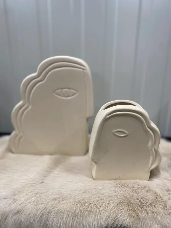 De Gezicht vaas is een uniek en modern woonaccessoire in een mat zandkleurige afwerking. Verkrijgbaar in hoogtes van 14 cm en 21 cm, deze vaas combineert functionaliteit met kunstzinnige uitstraling en is ideaal voor kleine bloemstukken of als zelfstandig decoratief object. Het speelse gezichtontwerp geeft je interieur een creatieve en persoonlijke touch, waardoor deze vaas een echte eyecatcher is in elke ruimte.